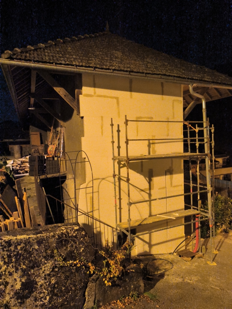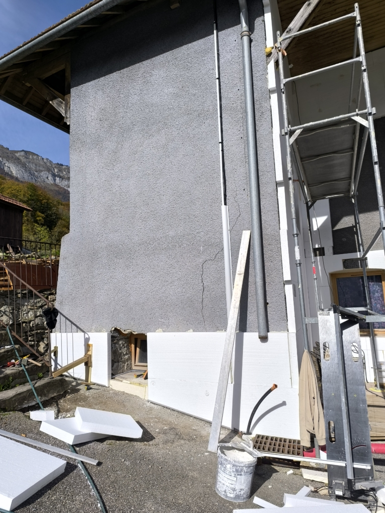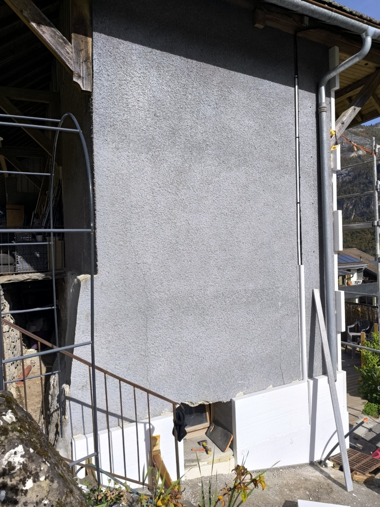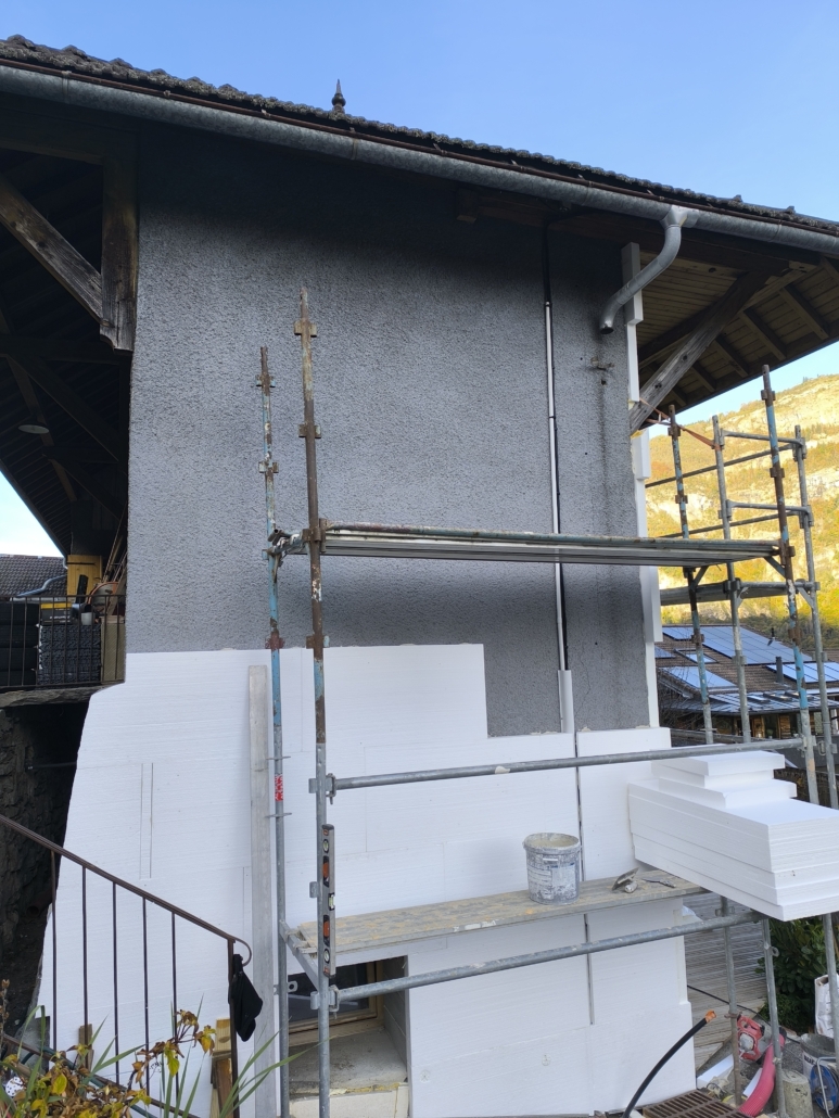 À Magland, cette maison entre dans une nouvelle phase de transformation grâce à la mise en œuvre d’une isolation thermique extérieure en polystyrène, pensée pour améliorer durablement le confort et la performance énergétique du logement.