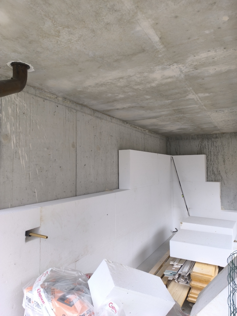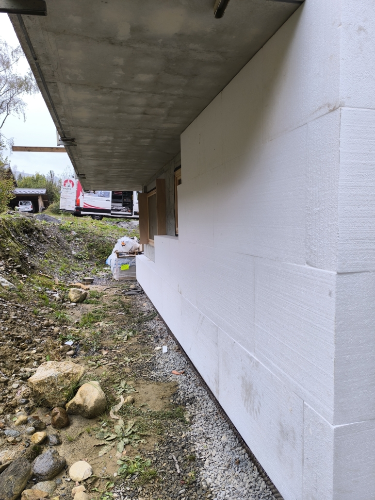 La pose du polystyrène progresse rapidement, assurant une meilleure protection thermique et une réduction des déperditions de chaleur. Bientôt, la façade prendra toute sa définition en crépi, pour un rendu harmonieux, moderne et résistant aux intempéries.