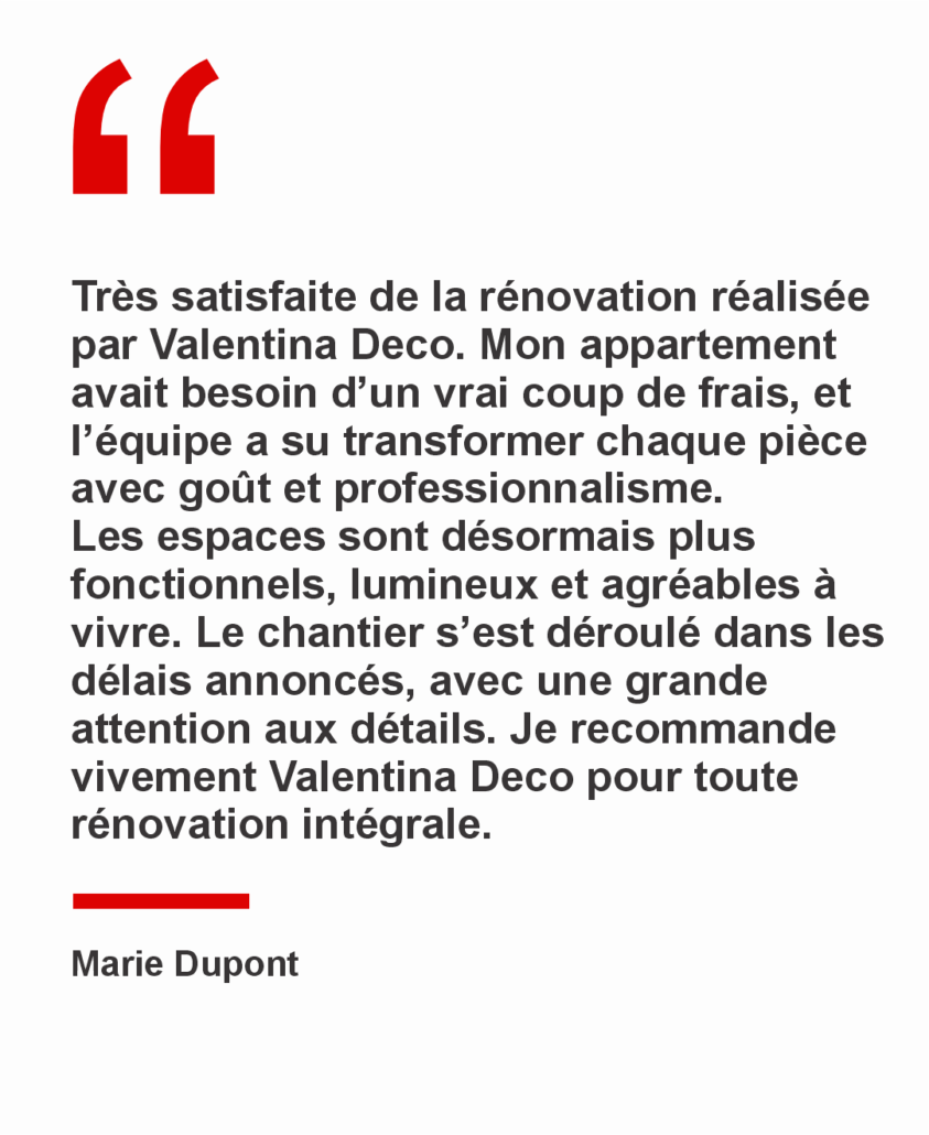 Valentina Deco est une entreprise spécialisée dans la rénovation intégrale en Haute-Savoie depuis 2013. Forte de plus de 30 ans d’expérience, notre société est reconnue pour son savoir-faire en peinture intérieure et extérieure, pose de parquet, plâtrerie, décoration personnalisée et projets complets de rénovation.